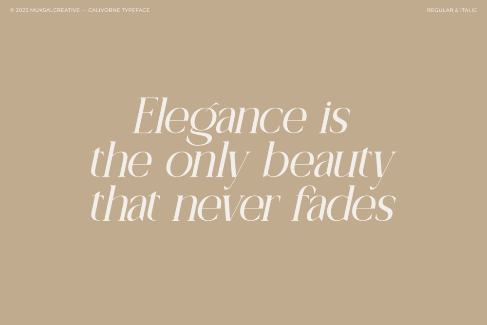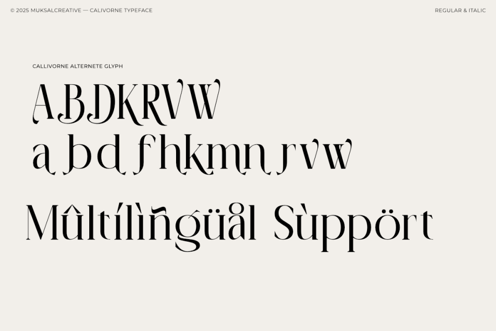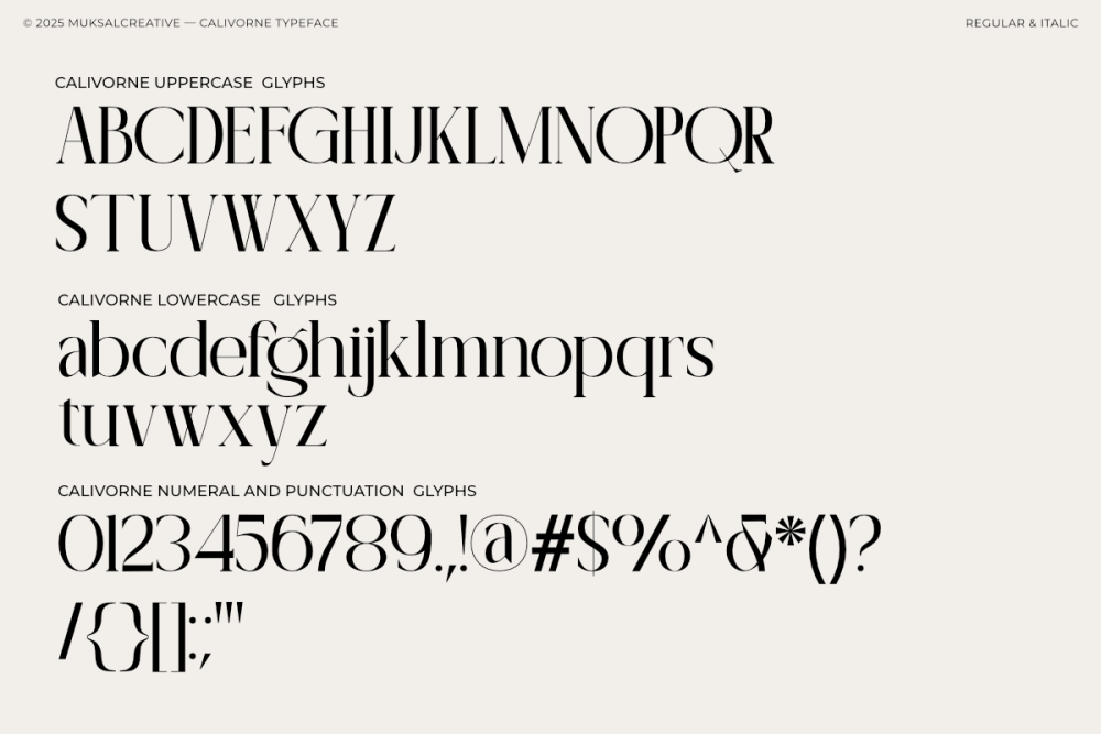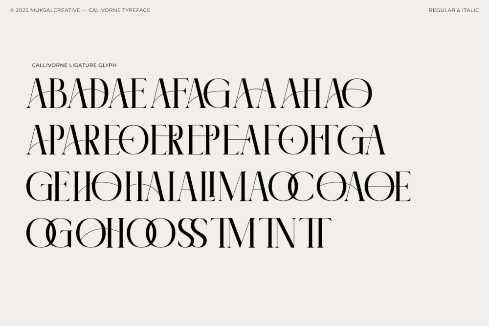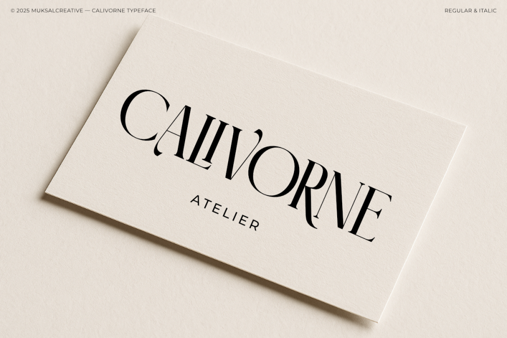 Featuring two styles — Regular and Italic, Calivorne offers flexibility for both display and body text compositions. Each style includes a collection of ligatures and alternate characters, adding unique personality and fluidity to your typography work. Whether you’re crafting a minimal brand identity or a high-end editorial title, Calivorne delivers enduring elegance in every letter.