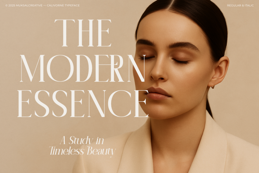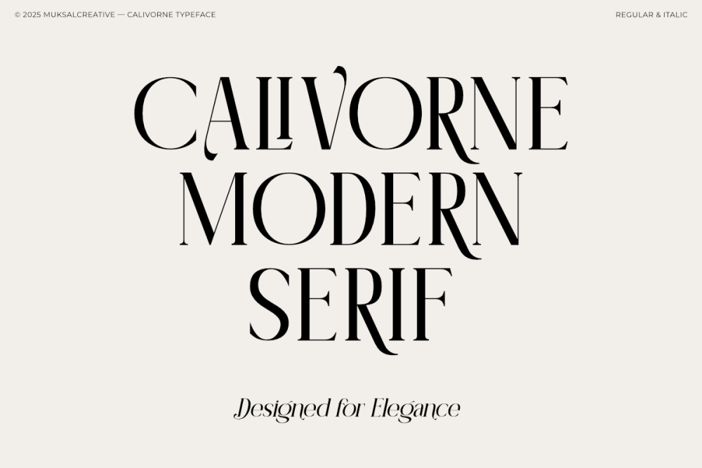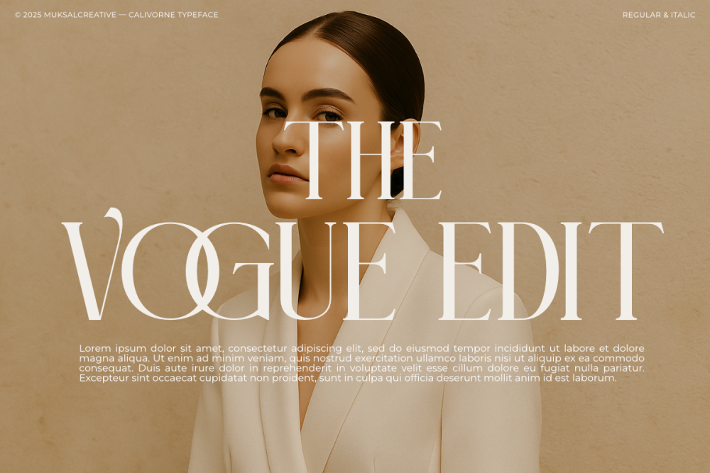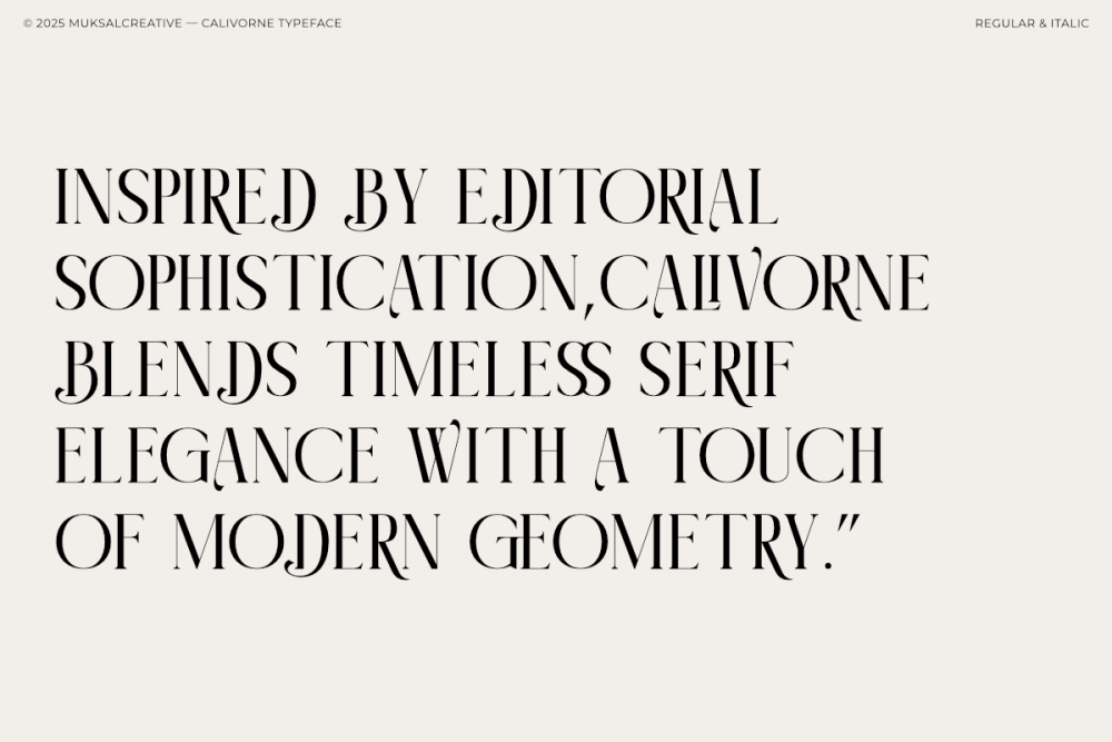 Calivorne is a timeless serif typeface that blends classic refinement with modern sophistication. Designed with graceful curves and high contrast strokes, it brings a sense of editorial beauty and luxury to any visual project. Its balanced proportions and elegant letterforms make it ideal for fashion branding, magazine layouts, packaging, and refined logo design.
