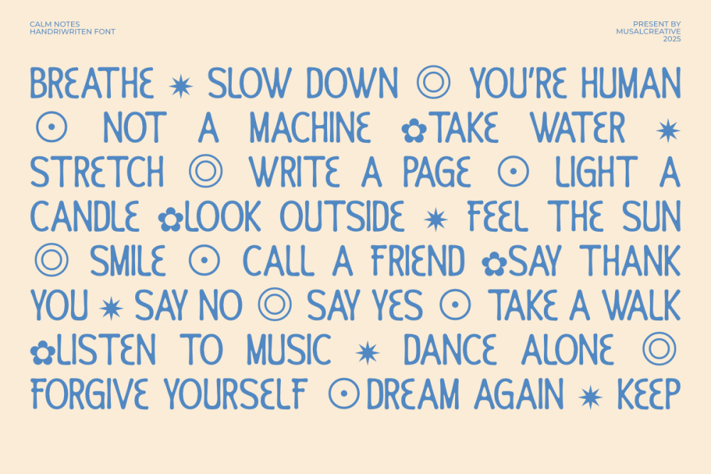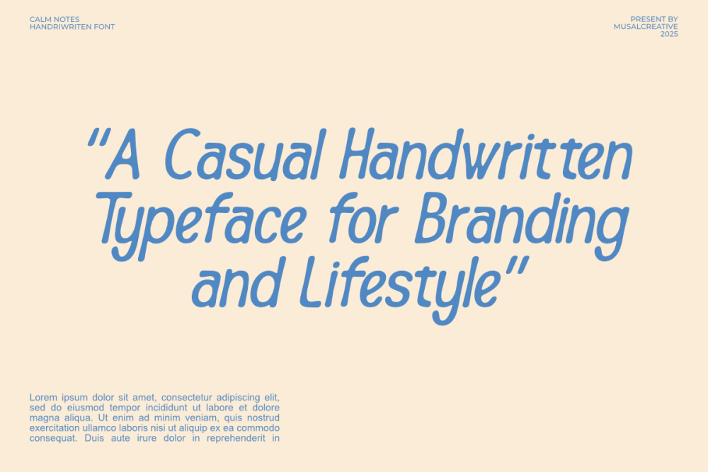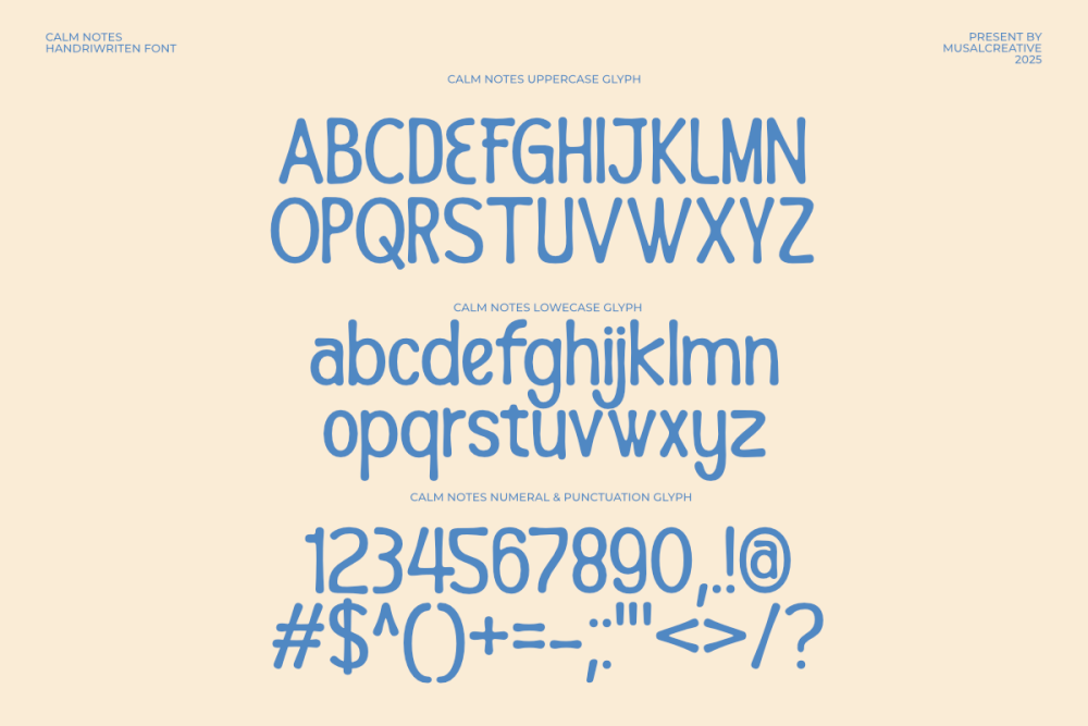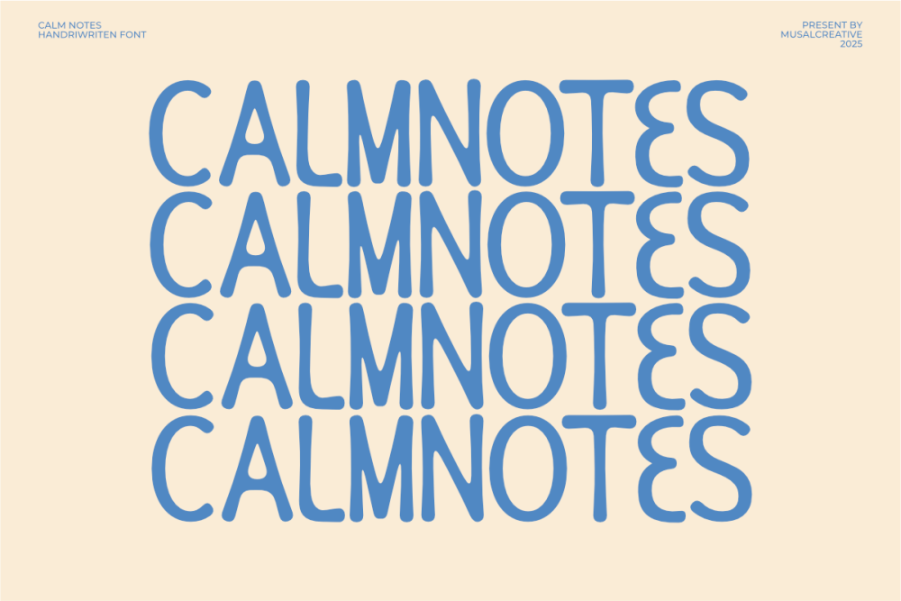 Calm Notes is a casual handwritten typeface designed to bring warmth, personality, and a touch of lifestyle charm into your projects. With its relaxed strokes and playful curves, this font feels natural and approachable—perfect for branding, packaging, social media, and editorial designs.