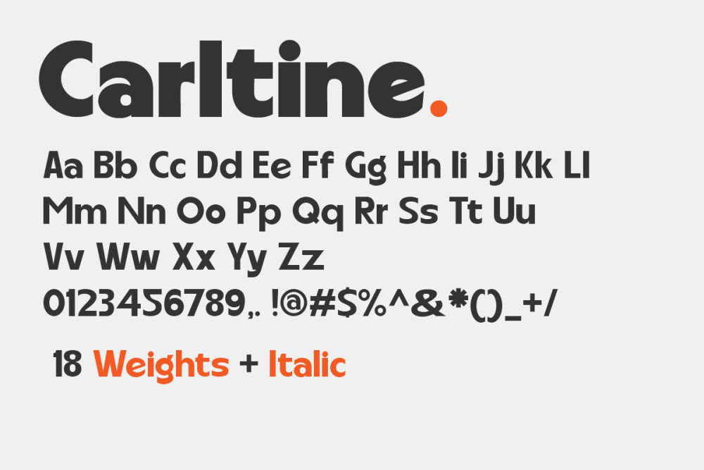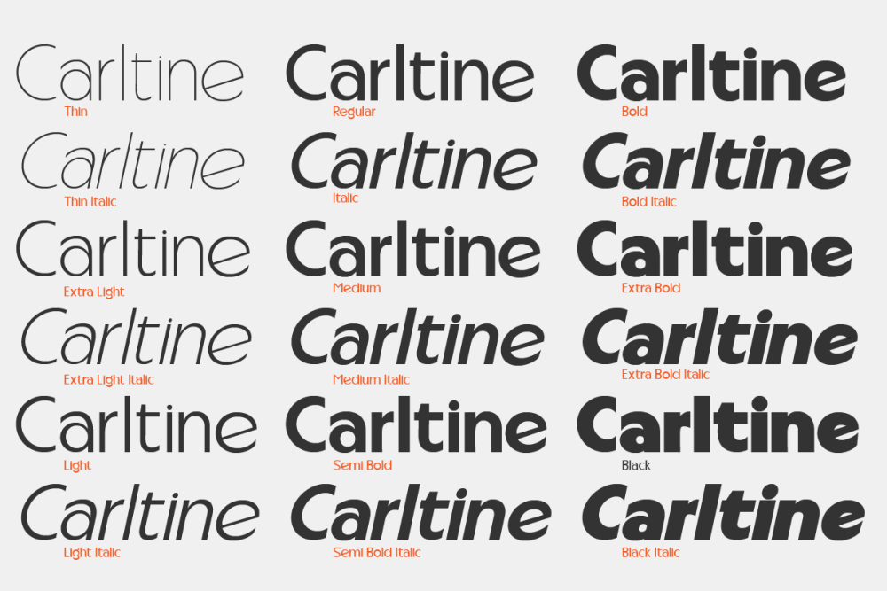 Carltine is a unique and modern family of Sans serif fonts. Simply Conception has 18 families Regular and italic font, starting from the small thin to the largest black. This typeface is versatile and can be used successfully in magazines, posters, branding, websites.