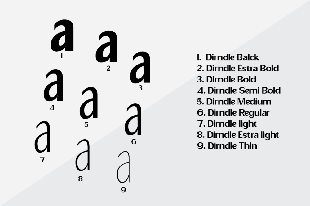 Dirndle is a unique and modern family of sans-serif fonts. Feragie has 9 families, starting from the small thin to the largest black. This typeface is versatile and can be used successfully in magazines, posters, branding, websites, etc.*