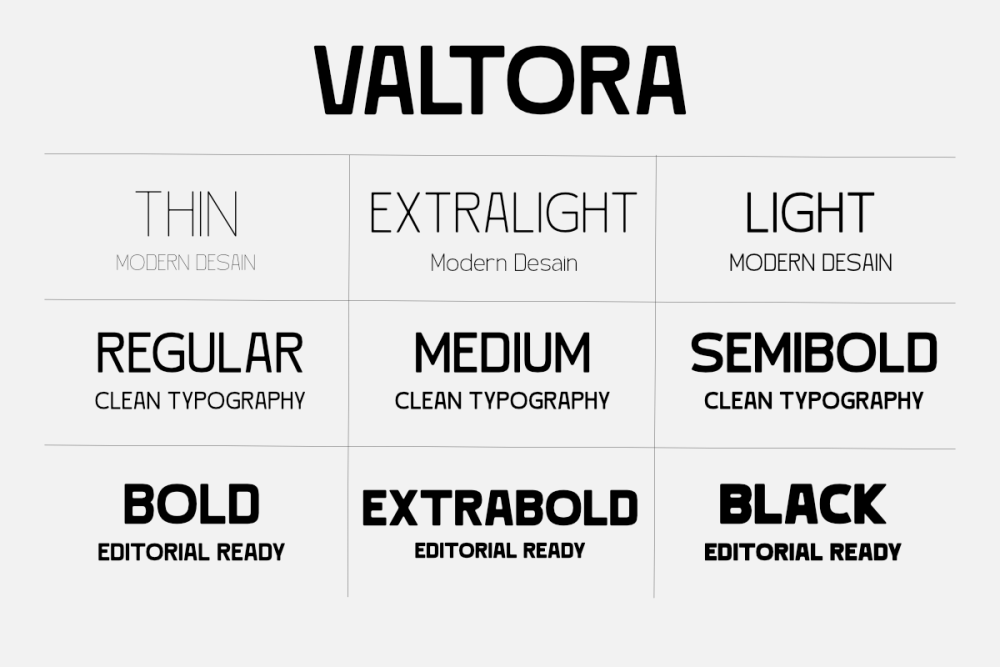 VALTORA is a modern sans serif font family designed for clean, professional, and contemporary visual communication. With a complete set of 9 styles from Thin to Black, Valtora provides a flexible typographic system that works beautifully across branding, editorial design, UI/UX, and digital products.